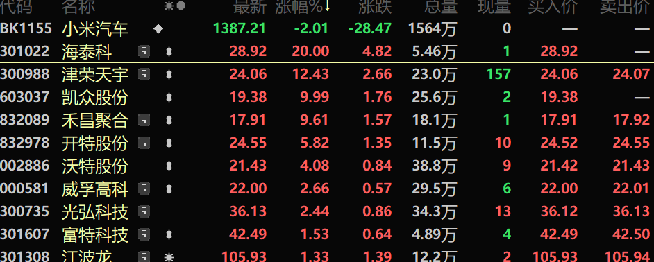 受此消息影响,港股小米集团-W盘前一度上涨超5%,盘中持续回调,最新跌幅超1%。小米汽车概念股开盘大涨,海泰科20cm涨停,凯众股份涨停,津荣天宇盘中涨停,威孚高科、奥特佳等个股上涨。