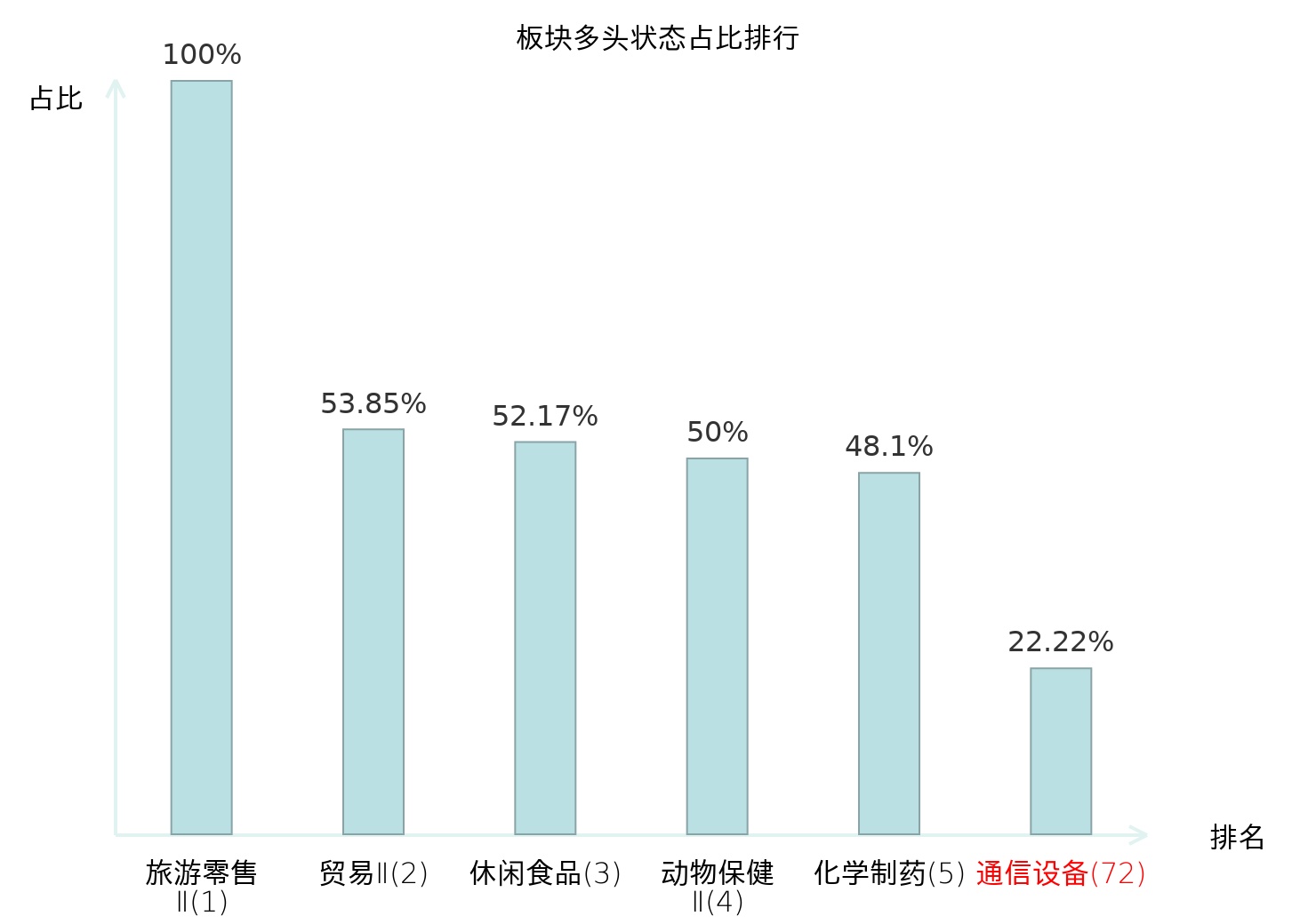 全市场所有行业板块中主力多头状态占比排名中,旅游零售Ⅱ板块位居第一。白酒Ⅱ板块名次提升最快,较昨日上升47位。