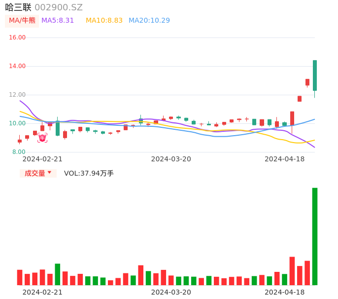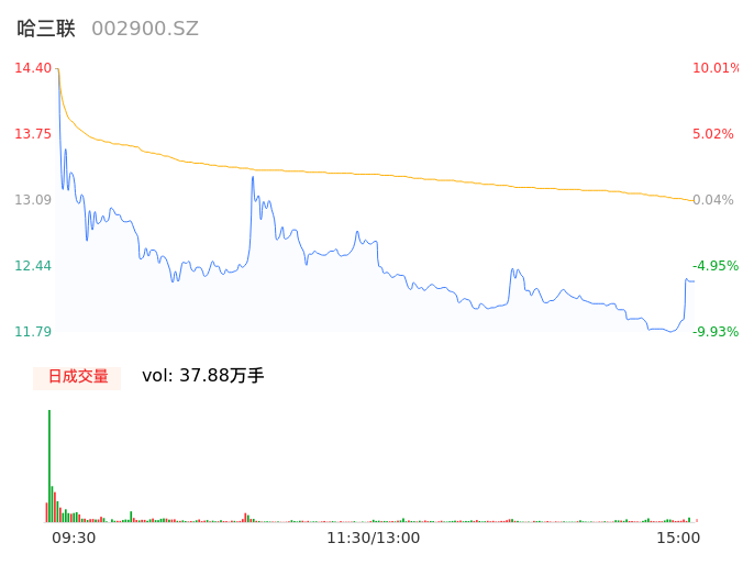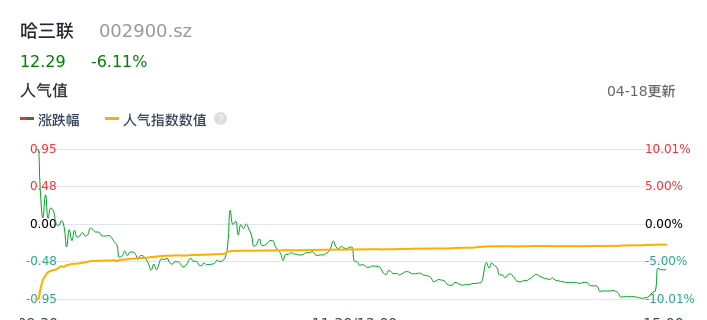 04月18日,哈三联收报12.29,股价涨幅-6.11%,成交金额4.97亿元,换手率22.20%。