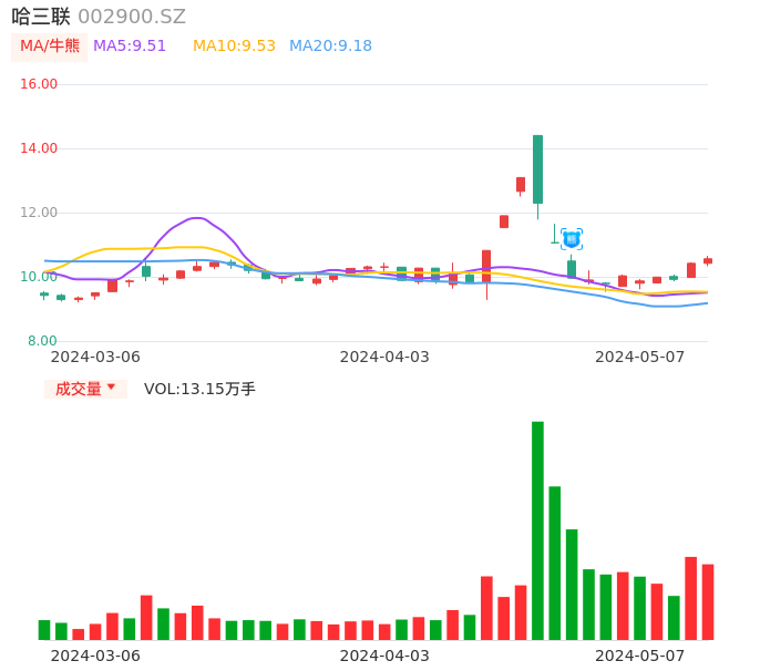 05月07日,哈三联收报10.56,股价涨幅1.34%,成交金额1.38亿元,换手率7.69%。
