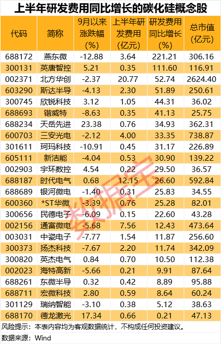 碳化硅概念股普遍注重研发创新,半年报数据显示,42只概念股今年上半年研发费用合计达到105.05亿元,24股研发费用同比去年实现增长,燕东微、英唐智控、北方华创研发费用同比增幅居前,分别达到221.21%、111.6%、52.74%。