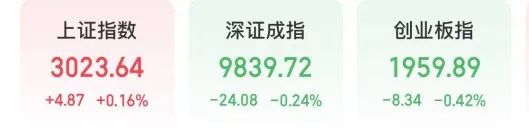 今天上午,A股三大股指走势分化,上证指数上涨0.16%,深证成指下跌0.24%,创业板指下跌0.42%。