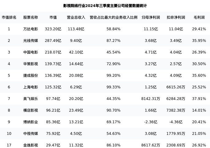 金逸影视最新报告期数据为三季度,下表汇总了影视院线行业内市值靠前的公司三季度主要经营数据