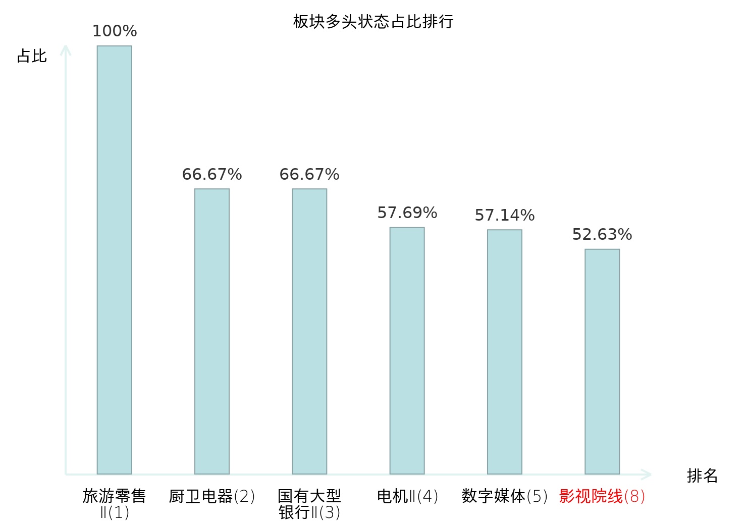 全市场所有行业板块中主力多头状态占比排名中,旅游零售Ⅱ板块位居第一。汽车服务板块名次提升最快,较昨日上升70位。