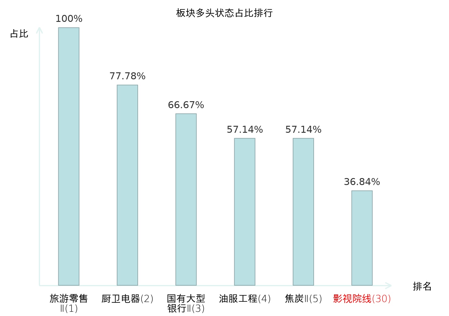 全市场所有行业板块中主力多头状态占比排名中,旅游零售Ⅱ板块位居第一。房地产服务板块名次提升最快,较昨日上升71位。