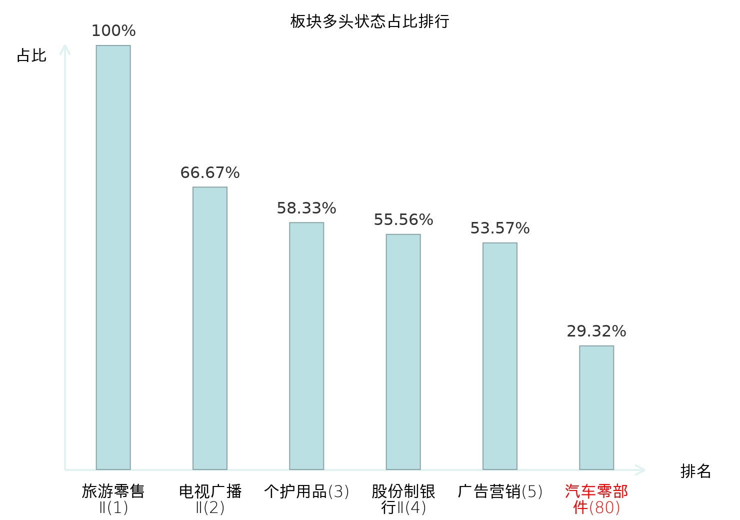 全市场所有行业板块中主力多头状态占比排名中,旅游零售Ⅱ板块位居第一。国有大型银行Ⅱ板块名次提升最快,较昨日上升106位。