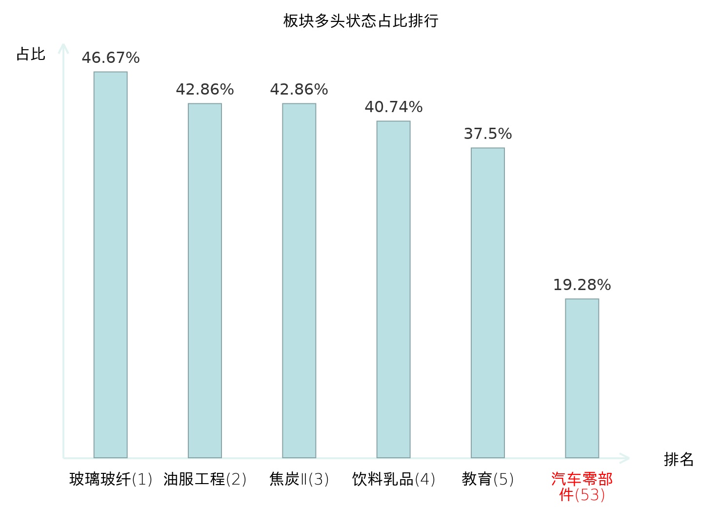 全市场所有行业板块中主力多头状态占比排名中,玻璃玻纤板块位居第一。航空机场板块名次提升最快,较昨日上升43位。