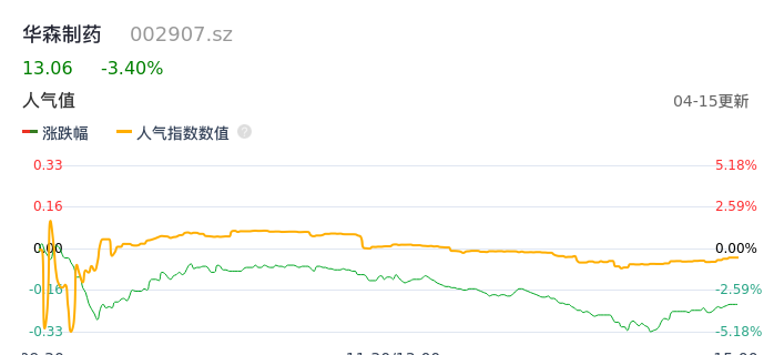 04月15日,华森制药收报13.06,股价涨幅-3.40%,成交金额3634.34万元,换手率0.90%。