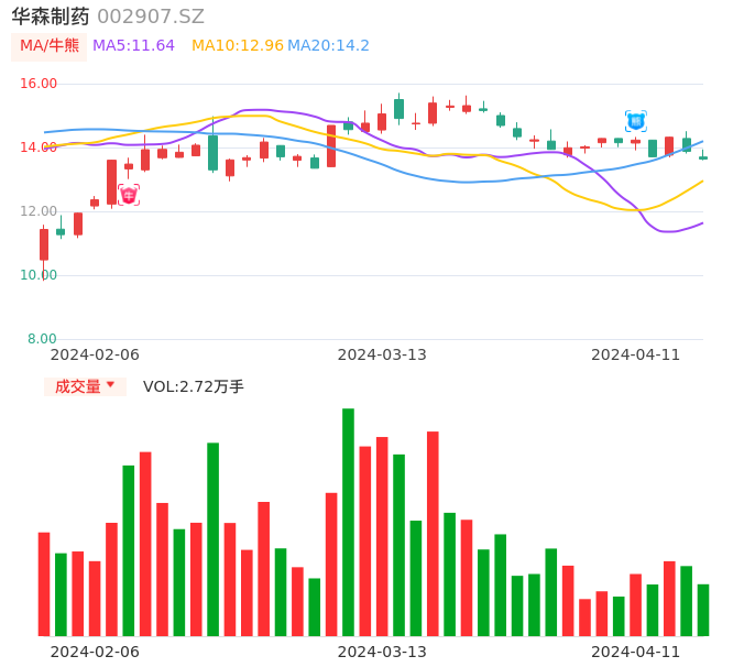 04月11日,华森制药收报13.64,股价涨幅-1.73%,成交金额3741.11万元,换手率0.88%。