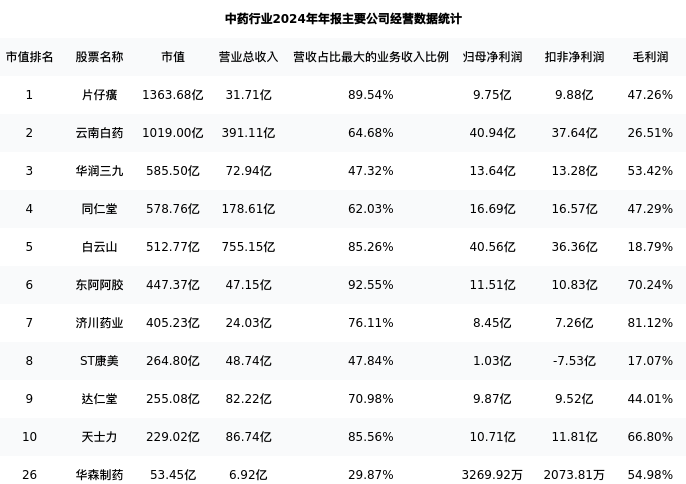华森制药最新报告期数据为年报,下表汇总了中药行业内市值靠前的公司年报主要经营数据