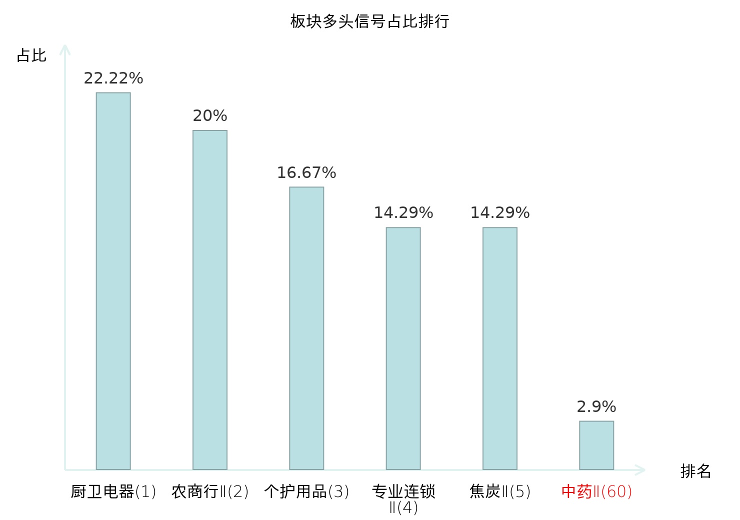 全市场所有行业板块中主力多头信号占比排名中,厨卫电器板块位居第一。专业连锁Ⅱ板块名次提升最快,较昨日上升117位。