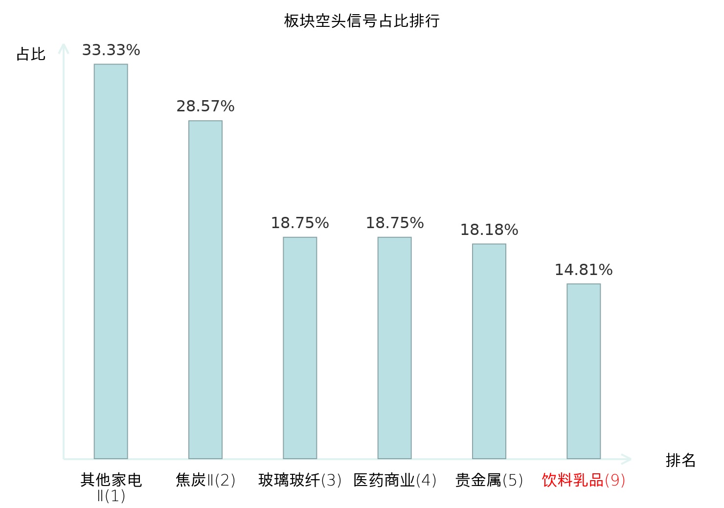 全市场所有行业板块中主力空头信号占比排名中,其他家电Ⅱ板块位居第一。工业金属板块名次提升最快,较昨日上升114位。