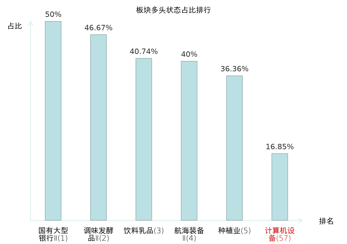 全市场所有行业板块中主力多头状态占比排名中,国有大型银行Ⅱ板块位居第一。金属新材料板块名次提升最快,较昨日上升71位。