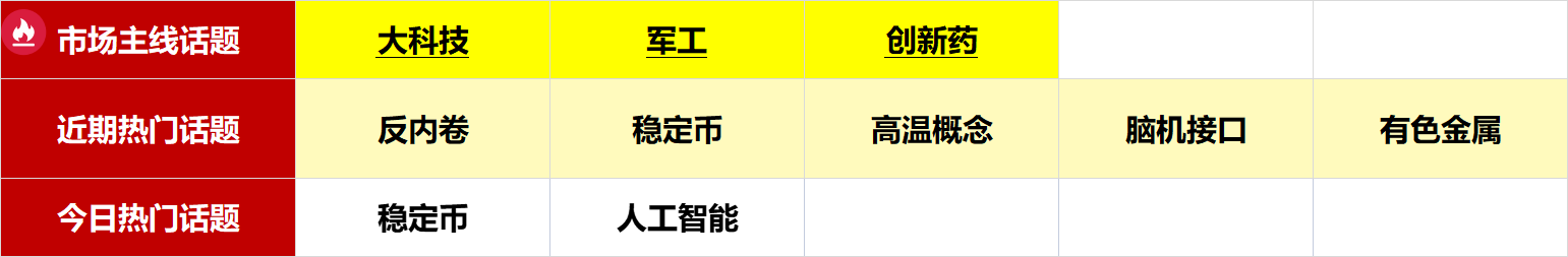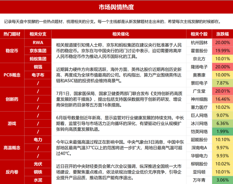 点评:稳定币上周五终于迎来了像样的反抽,上周五上午都是特别逆势的,周五盘前提的京北方跟信雅达,2个都涨停了,说明我们轮动的逻辑,上周五市场是完全认可了,在车上的可以给些耐心,继续看看,周末稳定比币热度不低,如果后续指数持续走强的话,这个板块完全可以类比14~15年那波互联网金融行情的,先看月底吧,8月1号之前会反复活跃的,其他的叠加RWA的协鑫能科,天阳科技上周五表现也不错,后续可以留意,高潮次日也就是今天谨慎追涨,当下市场只买分歧不追一致