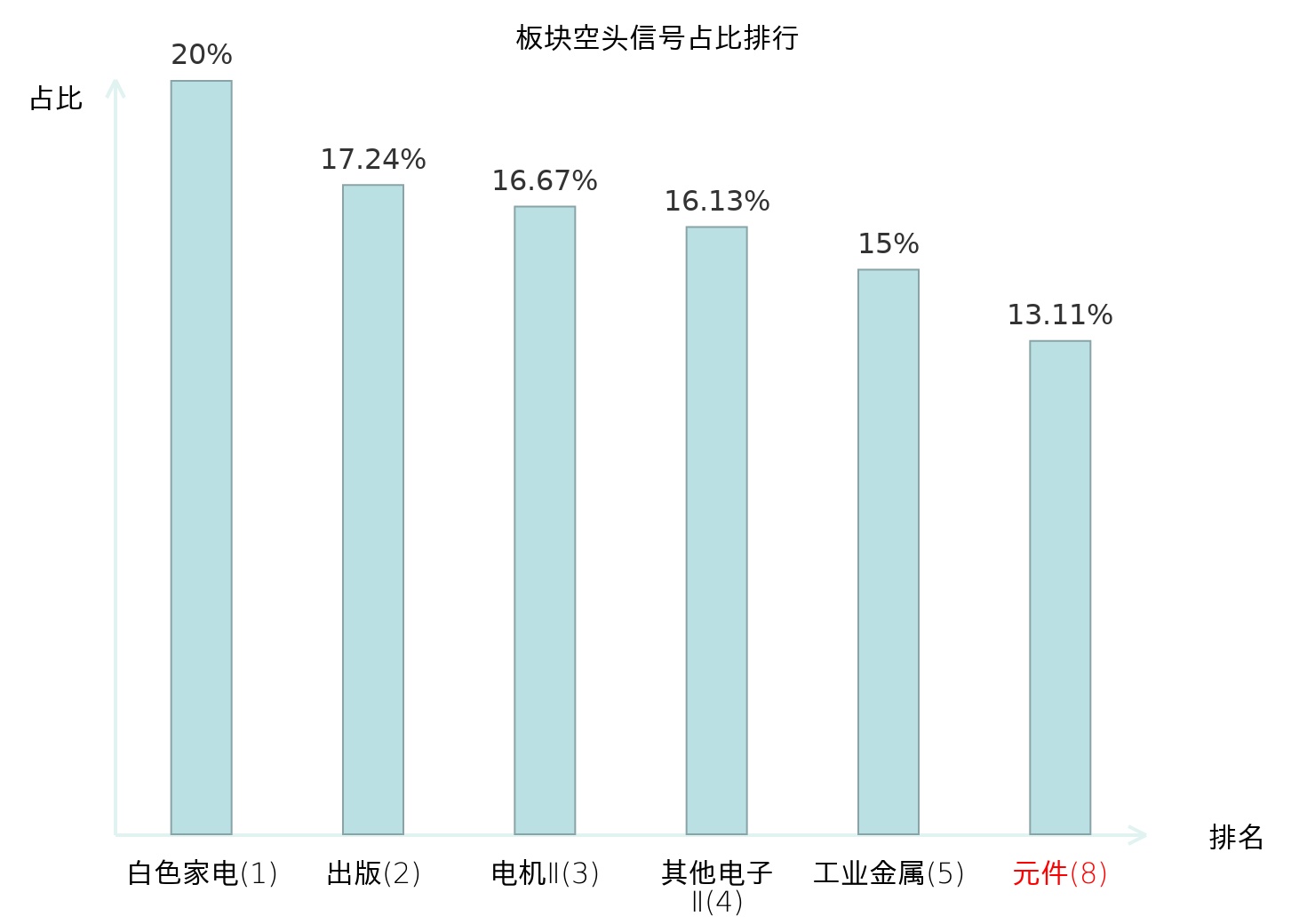 全市场所有行业板块中主力空头信号占比排名中,白色家电板块位居第一。其他电子Ⅱ板块名次提升最快,较昨日上升123位。