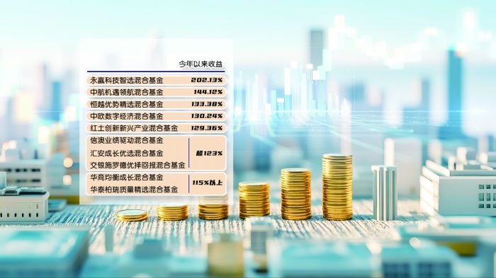 不过,第二至第十的排名现在还难见分晓。中航机遇领航混合基金今年以来收益为144.12%,恒越优势精选混合基金紧随其后,收益为133.38%。中欧数字经济混合基金今年以来收益为130.24%,红土创新新兴产业混合基金收益为129.36%。此外,信澳业绩驱动混合基金、汇安成长优选混合基金、交银施罗德优择回报混合基金等收益均超过123%。华商均衡成长混合基金、华泰柏瑞质量精选混合基金收益均在115%以上。从上述排名情况看,年终排名充满变数。