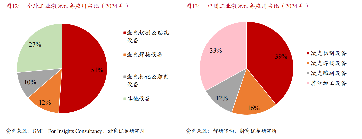 激光加工技术主要应用于切割、焊接与打标三大领域,其中,激光切割是应用最广泛的工艺。2024年激光切割及钻孔设备在全球激光设备市场中占比达51%,而在中国市场,仅激光切割设备的占比也已达到39%。