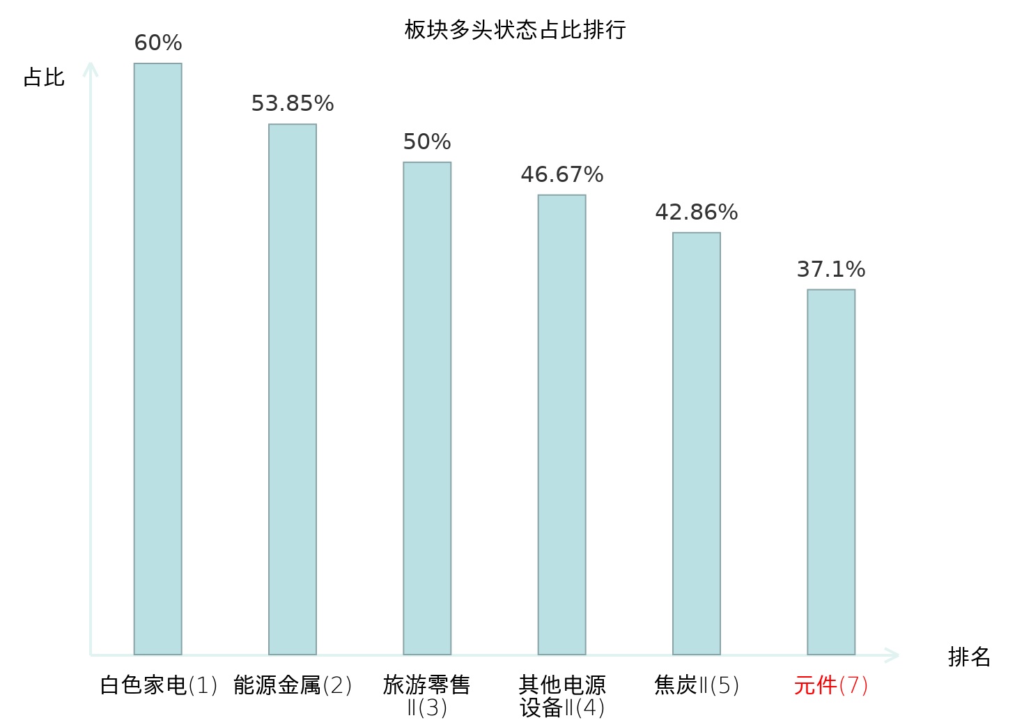 全市场所有行业板块中主力多头状态占比排名中,白色家电板块位居第一。油服工程板块名次提升最快,较昨日上升87位。