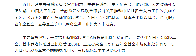 从今日反馈上来:昨晚计划好的今天盘中会有对于整个市场的会议总结,今天开盘就有市场消息,主要内容为对于长期资金的关注,长期资金对于市场的力度上来看,主要政策如下: