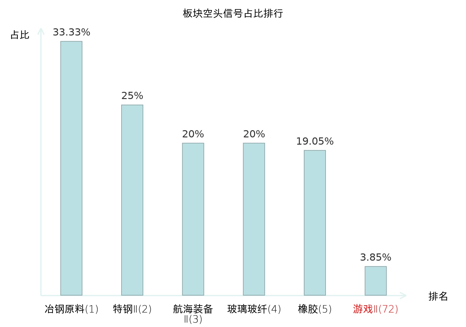 全市场所有行业板块中主力空头信号占比排名中,冶钢原料板块位居第一。军工电子Ⅱ板块名次提升最快,较昨日上升98位。