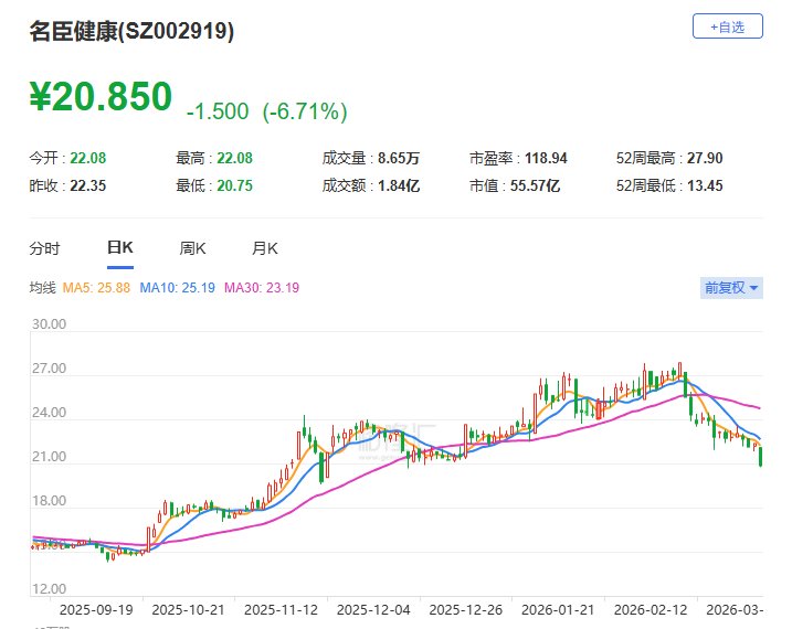 A股异动丨名臣健康跌逾7% 股价创逾3个月新低
