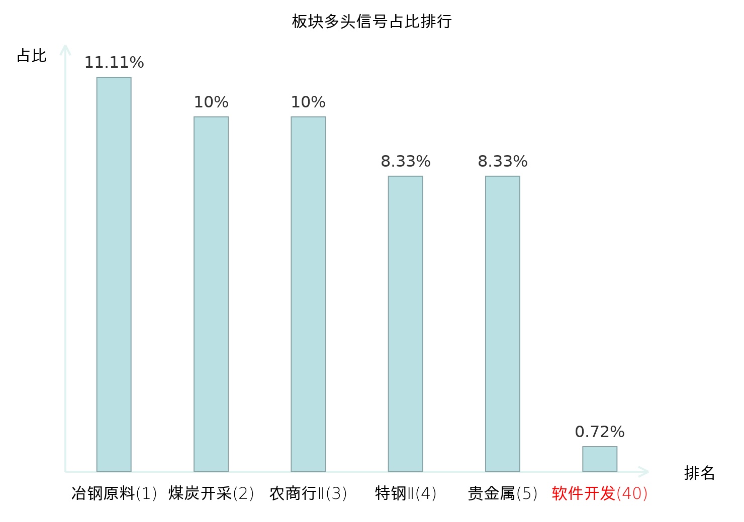 全市场所有行业板块中主力多头信号占比排名中,冶钢原料板块位居第一。冶钢原料板块名次提升最快,较昨日上升117位。