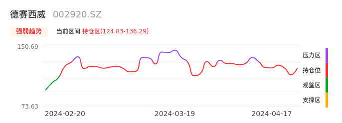 我们来看一下该股的九方特色指标强弱趋势的情况:德赛西威自04月10日从压力区回到持仓区。股价在持仓区盘整一段时间后,目前有启稳迹象。后续重点关注上方压力位:136.29元是否能重新上攻。