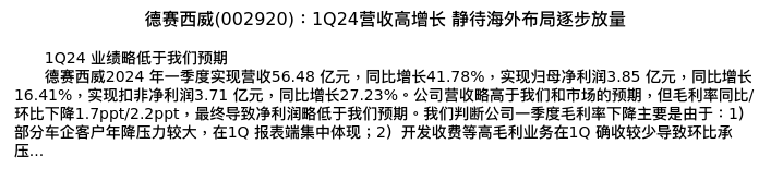 值得注意的是:2024年04月中金公司的李诗雯/陈昊分析师,首次发布关于德赛西威的研究报告,标题为:德赛西威(002920):1Q24营收高增长 静待海外布局逐步放量。