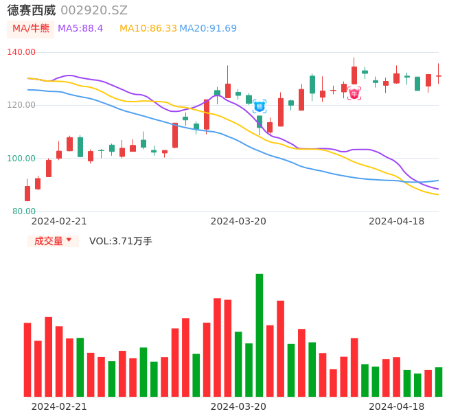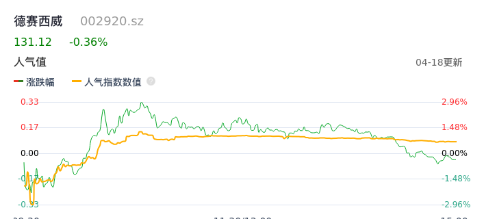 04月18日,德赛西威收报131.12,股价涨幅-0.36%,成交金额4.93亿元,换手率0.67%。
