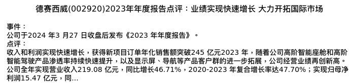 值得注意的是:2024年04月国元证券的耿军军分析师,首次发布关于德赛西威的研究报告,标题为:德赛西威(002920)2023年年度报告点评:业绩实现快速增长 大力开拓国际市场。