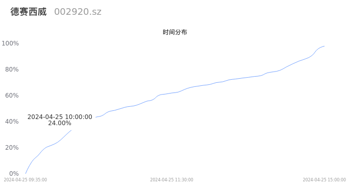 首先我们来看当日成交的时间分布。将今日交易时间按照5分钟的时间间隔进行切片,并绘制分布直方图进行观察。可以发现,10点之前的成交量占全天成交量的24.00%,这说明,该股票活跃时段换手率一般,资金热度较一般。
