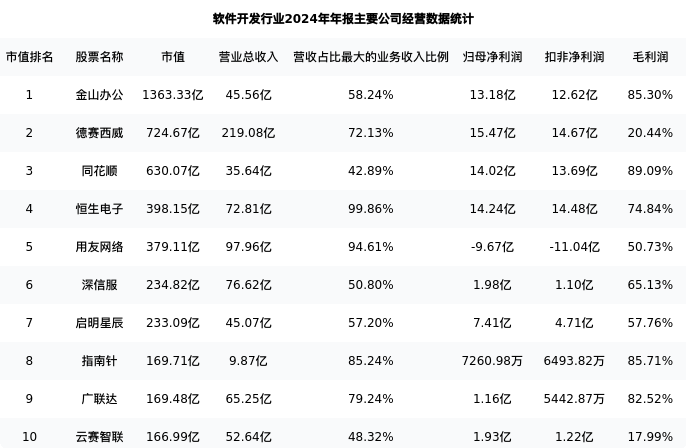 德赛西威最新报告期数据为年报,下表汇总了软件开发行业内市值靠前的公司年报主要经营数据