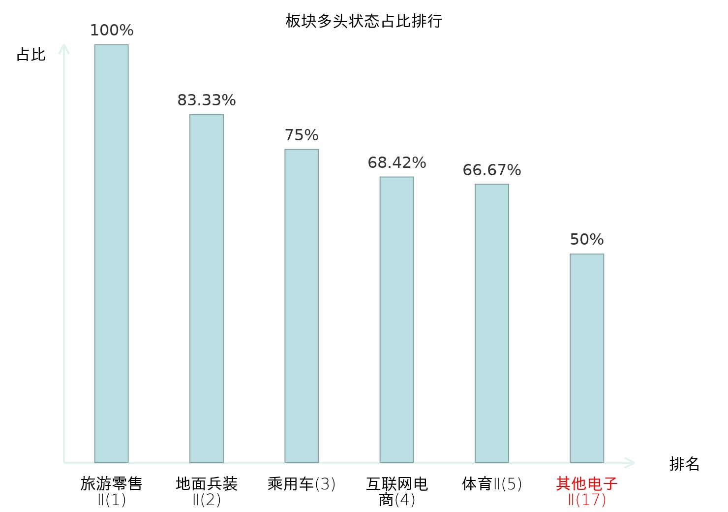全市场所有行业板块中主力多头状态占比排名中,旅游零售Ⅱ板块位居第一。房屋建设Ⅱ板块名次提升最快,较昨日上升50位。