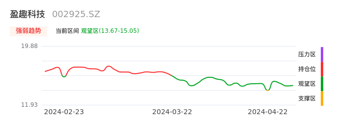 我们来看一下该股的九方特色指标强弱趋势的情况:盈趣科技自04月17日从支撑区回到观望区。股价经过前期快速下跌后中途弱势整理。现在下跌动能有重新放大迹象,弱势反弹行情可能临近尾声。建议继续谨慎观望。