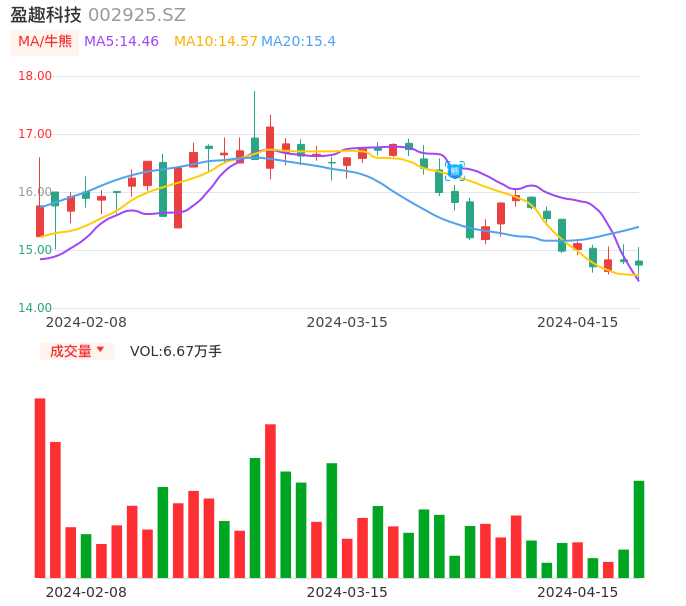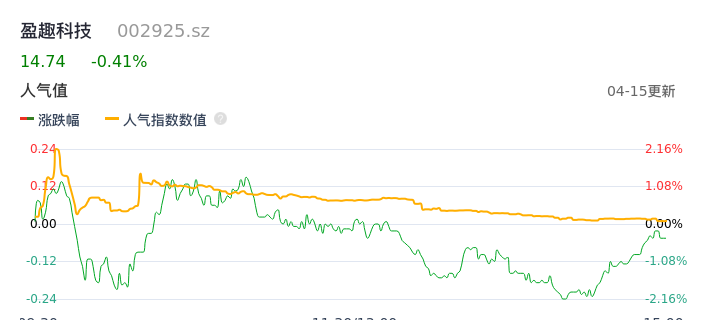 04月15日,盈趣科技收报14.74,股价涨幅-0.41%,成交金额9833.99万元,换手率0.91%。