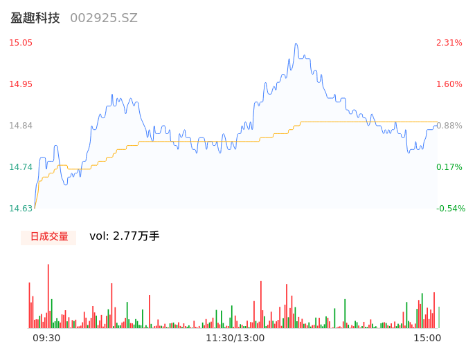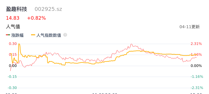 04月11日,盈趣科技收报14.83,股价涨幅0.82%,成交金额4119.51万元,换手率0.38%。