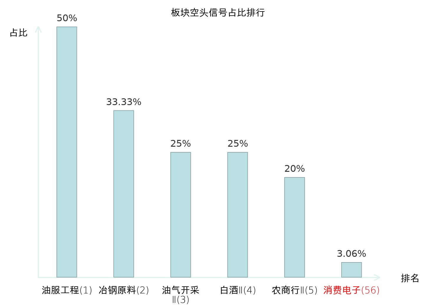 全市场所有行业板块中主力空头信号占比排名中,油服工程板块位居第一。白酒Ⅱ板块名次提升最快,较昨日上升110位。
