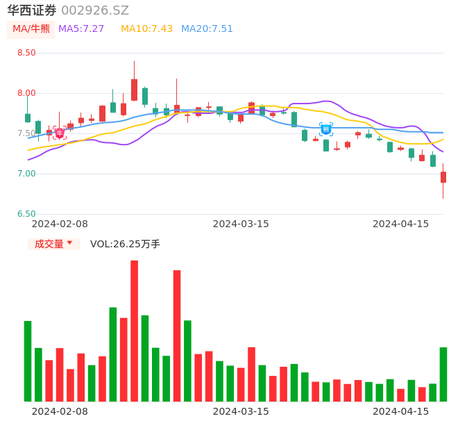 04月15日,华西证券收报7.02,股价涨幅-0.99%,成交金额1.82亿元,换手率1.00%。