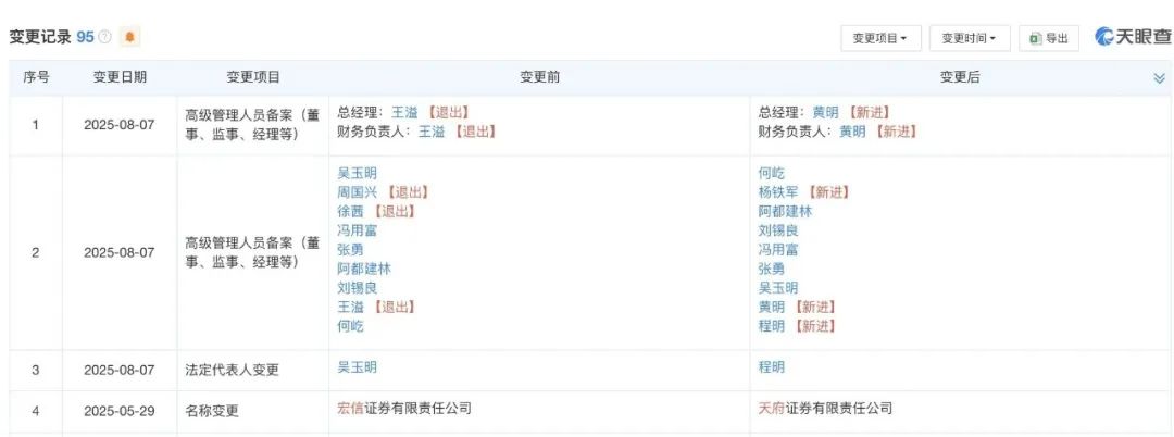 天眼查信息显示,天府证券(更名前:宏信证券)近日对法定代表人、董事、高管等进行工商登记变更。其中,公司法定代表人由吴玉明变更为程明,总经理由王溢变更为黄明。