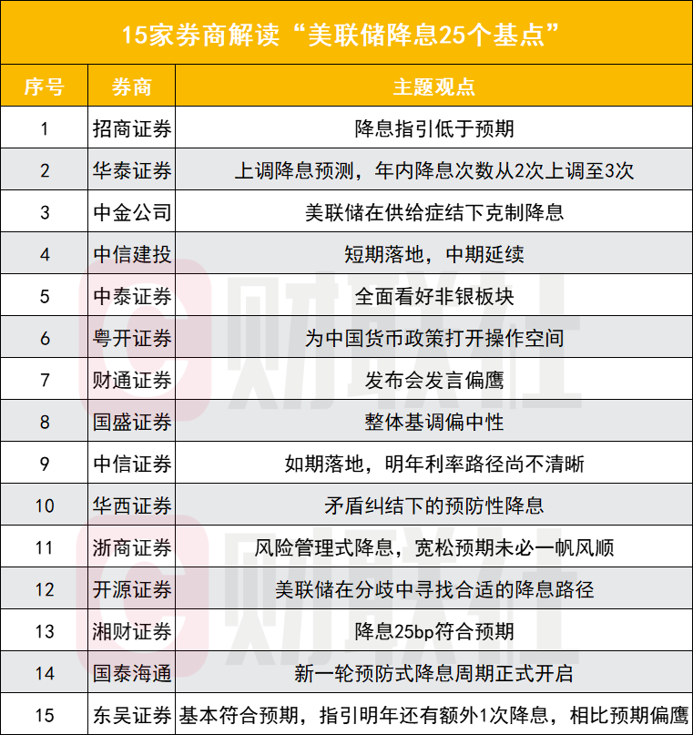 截至发稿,已有超过15家券商研究所发布相关研报,“符合预期”成为主流判断,而"10月、12月议息会议有望各降息25个基点"获得多数认同。