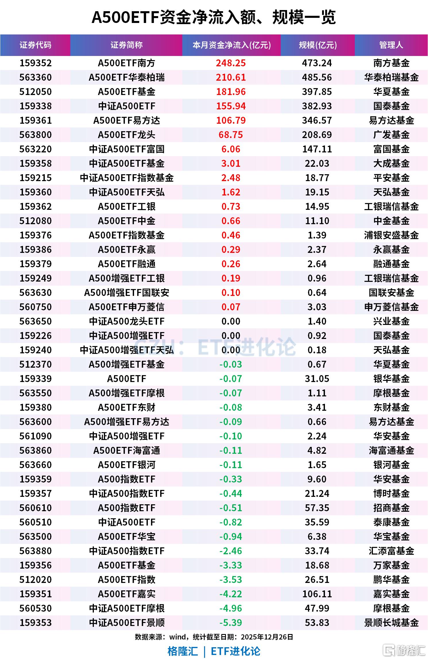 具体来看,A500ETF南方、A500ETF华泰柏瑞、A500ETF基金、中证A500ETF、A500ETF易方达、A500ETF龙头自12月以来资金净流入额分别为248.25亿元、210.61亿元、181.96亿元、155.94亿元、106.79亿元、68.75亿元,合计吸金超972亿元。