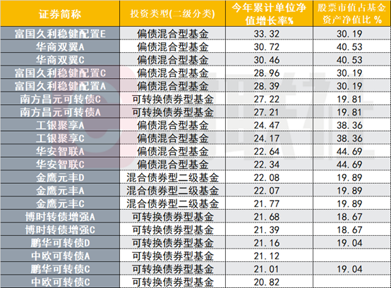 具体来看,今年表现最好的“固收+”基金净值增长已超过30%,多只“固收+”的净值增长超过20%。富国久利稳健配置A/C/E、华商双翼A/C、工银聚享A/C、金鹰元丰A/C/D等“固收+”基金今年已取得的回报居前。