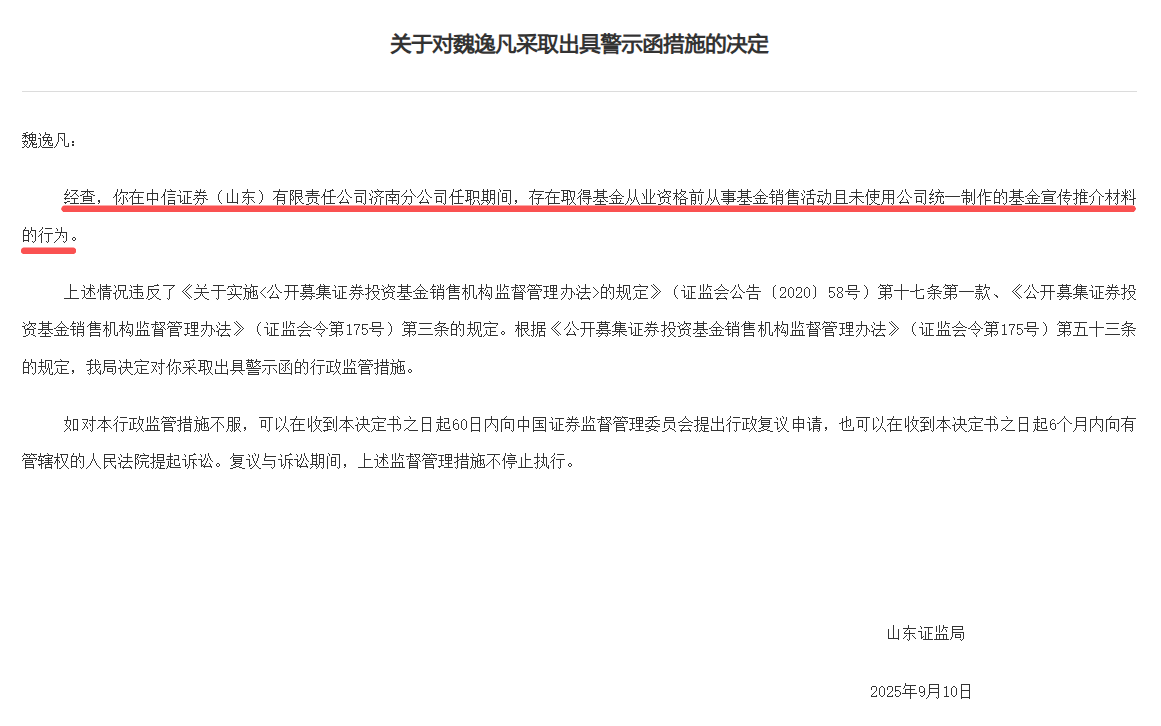 具体来看,魏逸凡在中信证券(山东)济南分公司任职期间,存在取得基金从业资格前从事基金销售活动且未使用公司统一制作的基金宣传推介材料的行为。