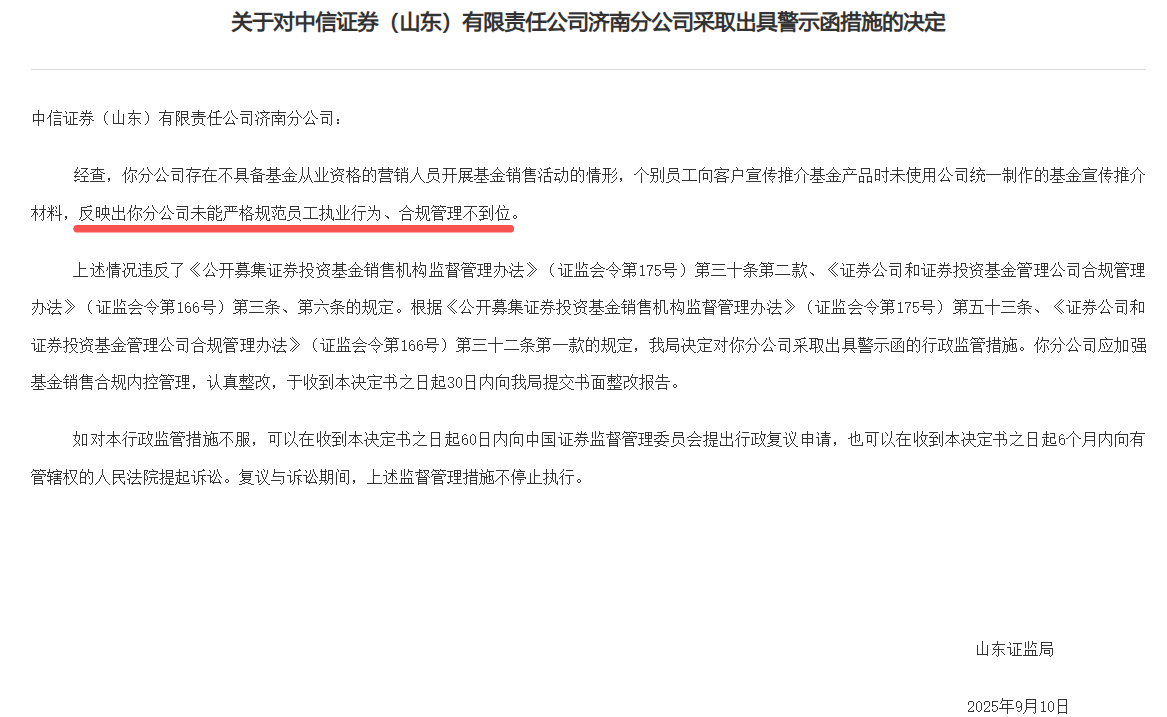 中信证券(山东)济南分公司存在不具备基金从业资格的营销人员开展基金销售活动的情形,个别员工向客户宣传推介基金产品时未使用公司统一制作的基金宣传推介材料,反映出分公司未能严格规范员工执业行为、合规管理不到位。