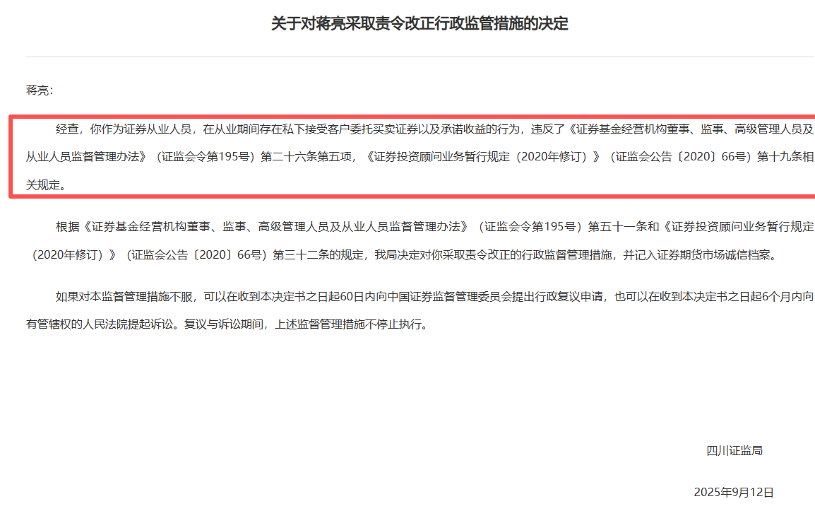 蒋亮作为证券从业人员,在从业期间存在私下接受客户委托买卖证券以及承诺收益的行为。