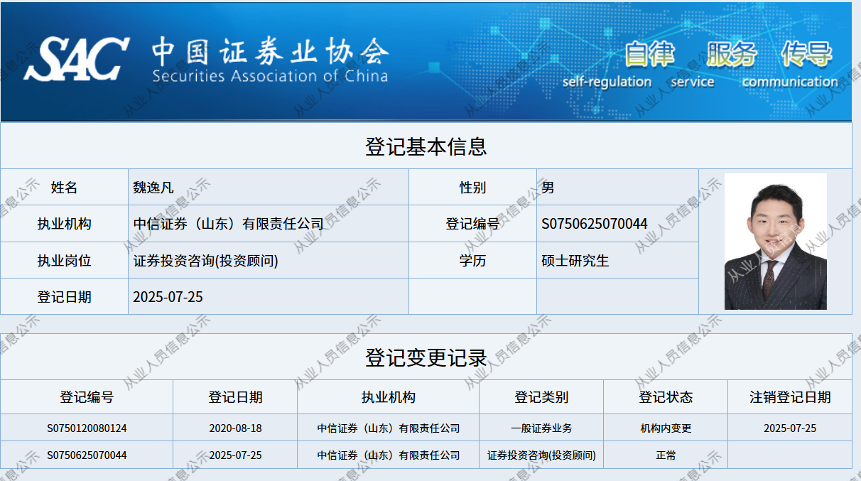 中证协从业人员信息公示显示,2020年8月18日,魏逸凡在中信证券(山东)执业,2025年7月25日,魏逸凡的执业登记类别由此前的“一般证券业务”转为“证券投资咨询(投资顾问)”执业机构仍为中信证券(山东)。