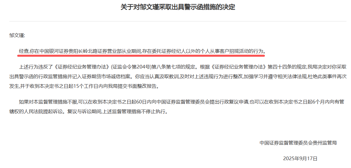 邹文瑾在银河证券贵阳长岭北路证券营业部从业期间,存在委托证券经纪人以外的个人从事客户招揽活动的行为。