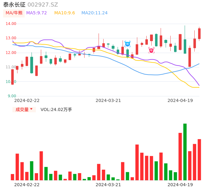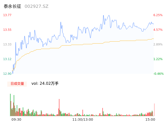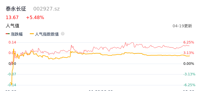 04月19日,泰永长征收报13.67,股价涨幅5.48%,成交金额3.22亿元,换手率10.89%。