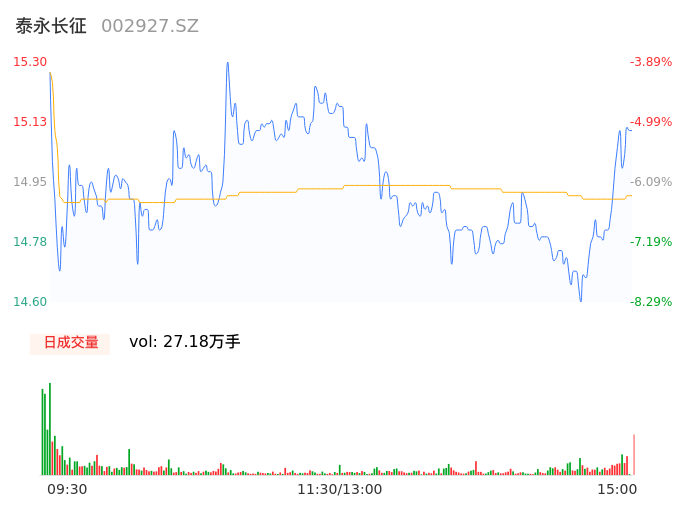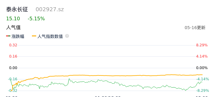 05月16日,泰永长征收报15.10,股价涨幅-5.15%,成交金额4.05亿元,换手率12.32%。