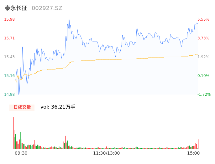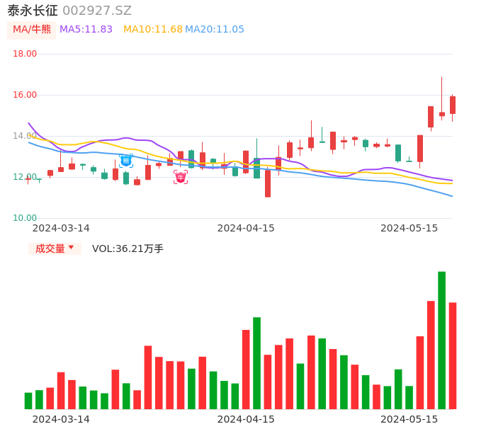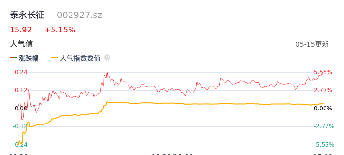 05月15日,泰永长征收报15.92,股价涨幅5.15%,成交金额5.60亿元,换手率16.41%。